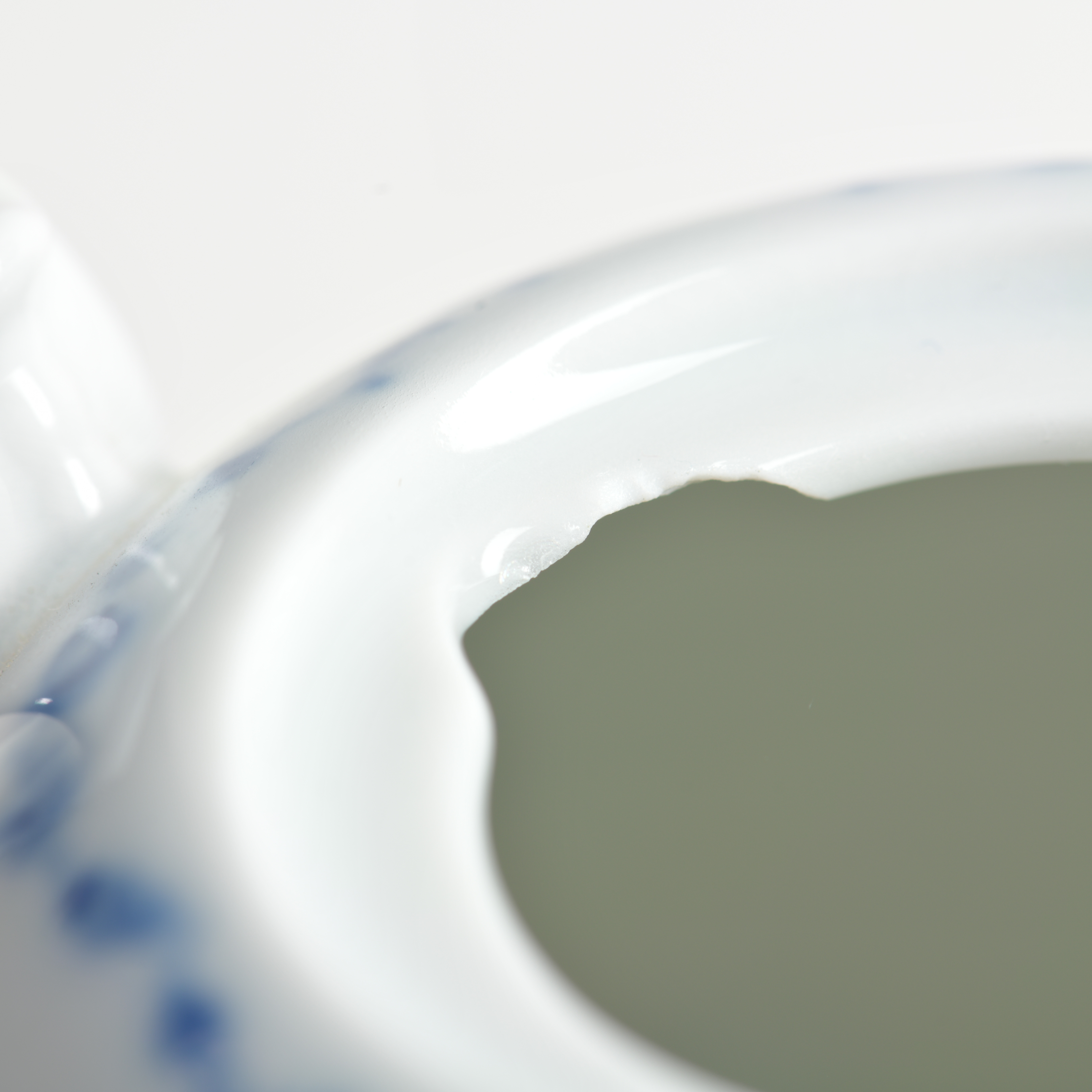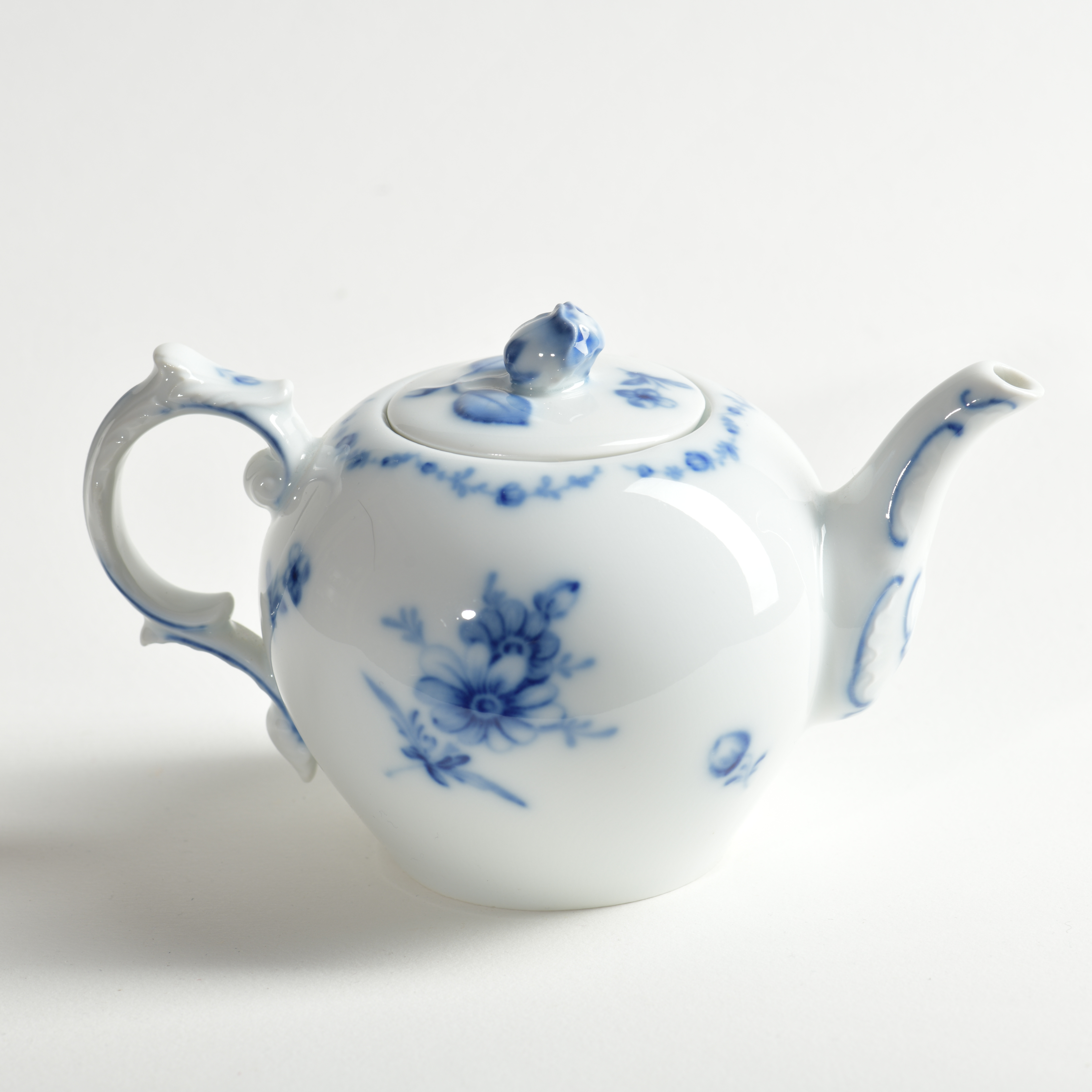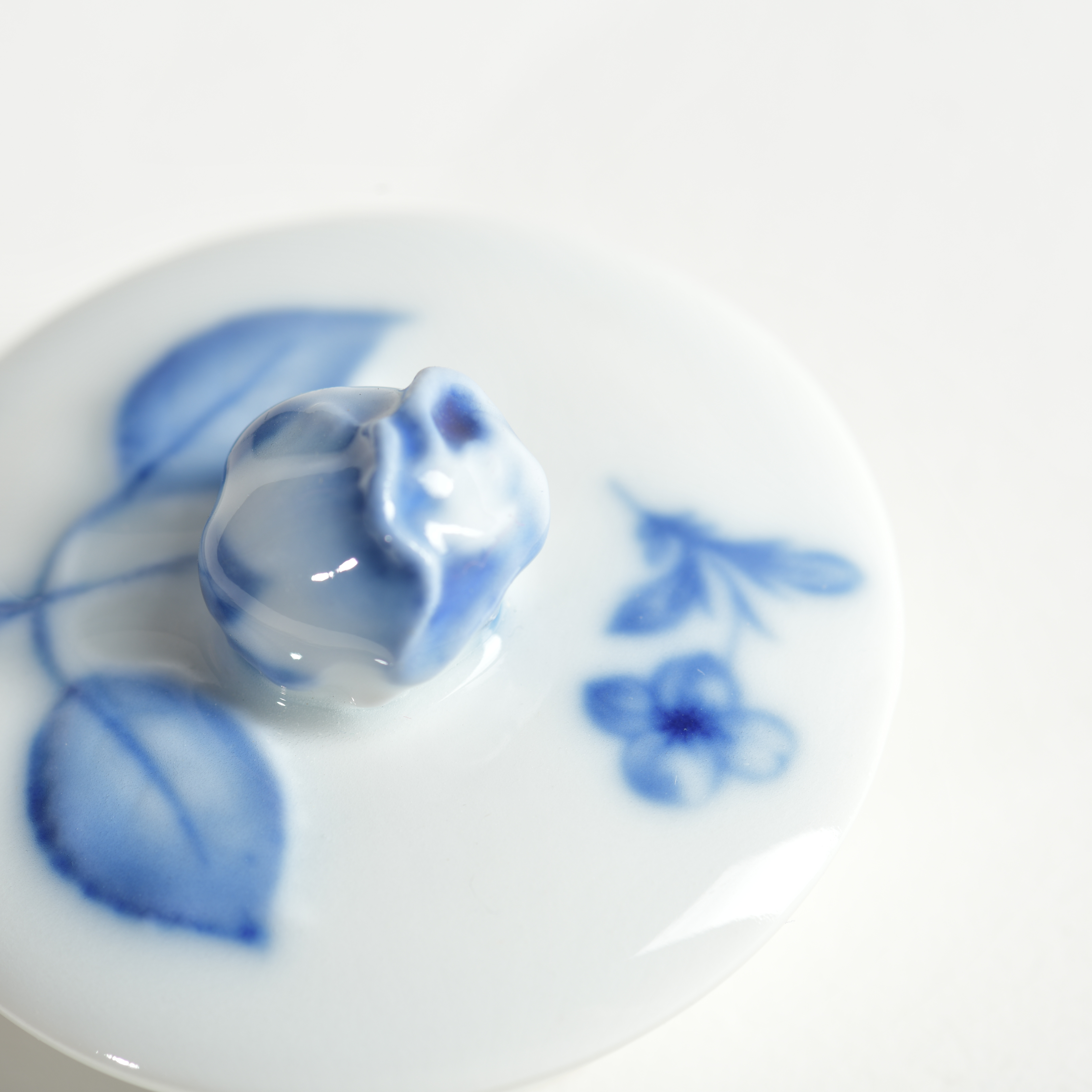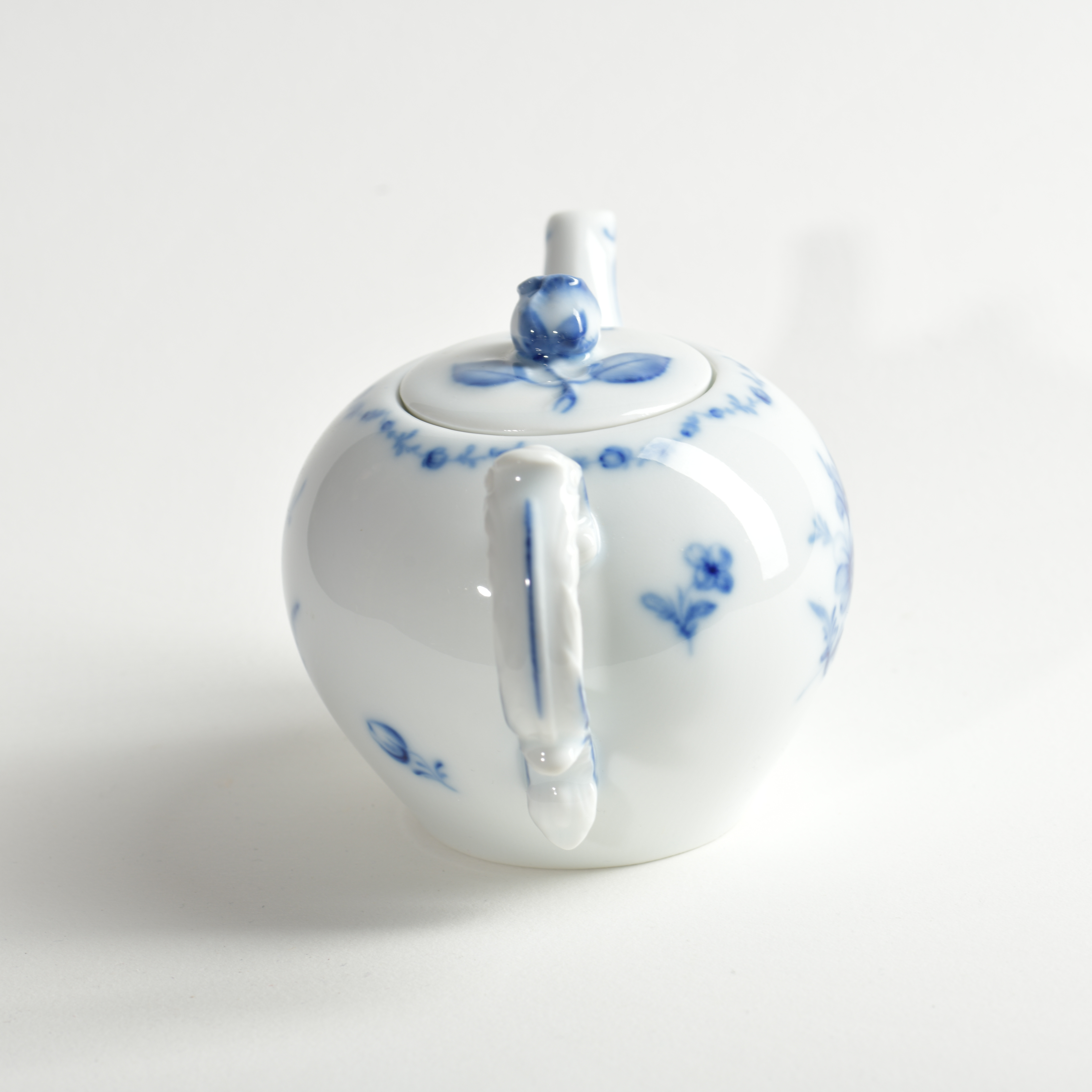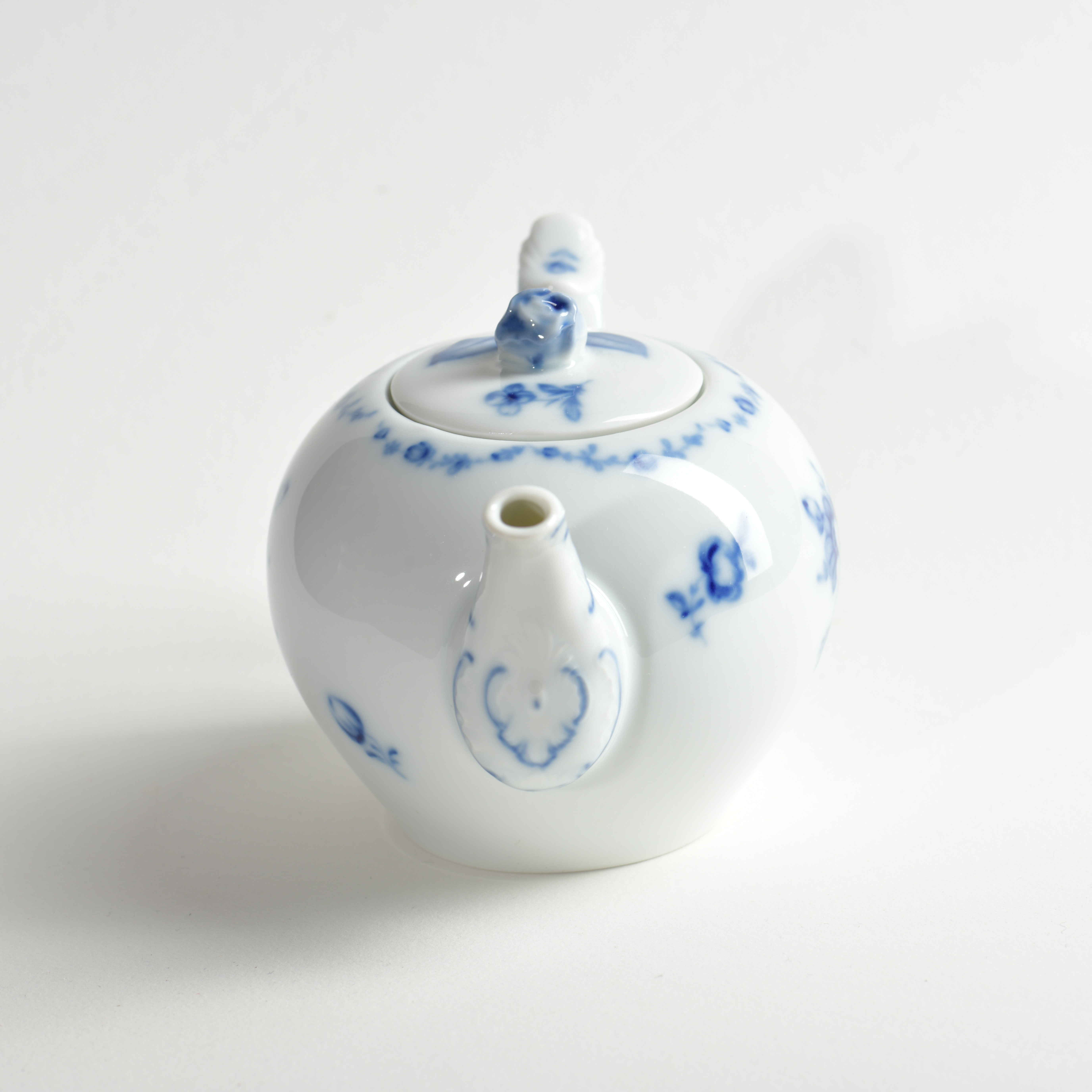 Very pretty blue and white teapot with a tiny rosebud handle for the lid. Perfect for that single cup of tea!