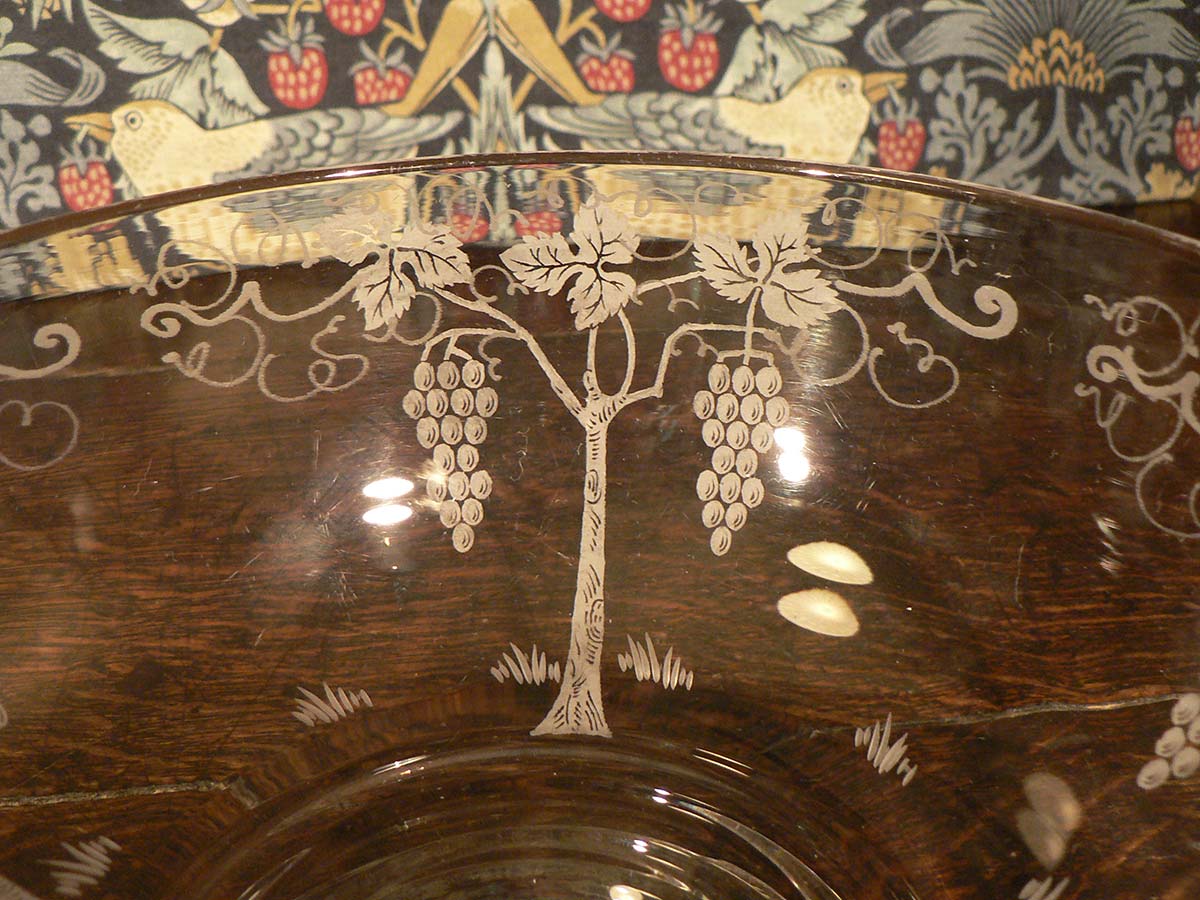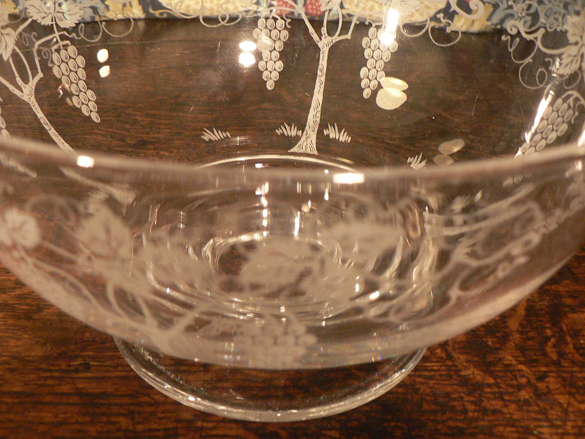 A lovely Stuart crystal bowl, etched grape tree vine pattern. Stuart brand name etched on base but very hard to photograph. A couple of minor scratches to the bowl. 11cm high, 20cm diameter bowl, 11.5cm diameter base.