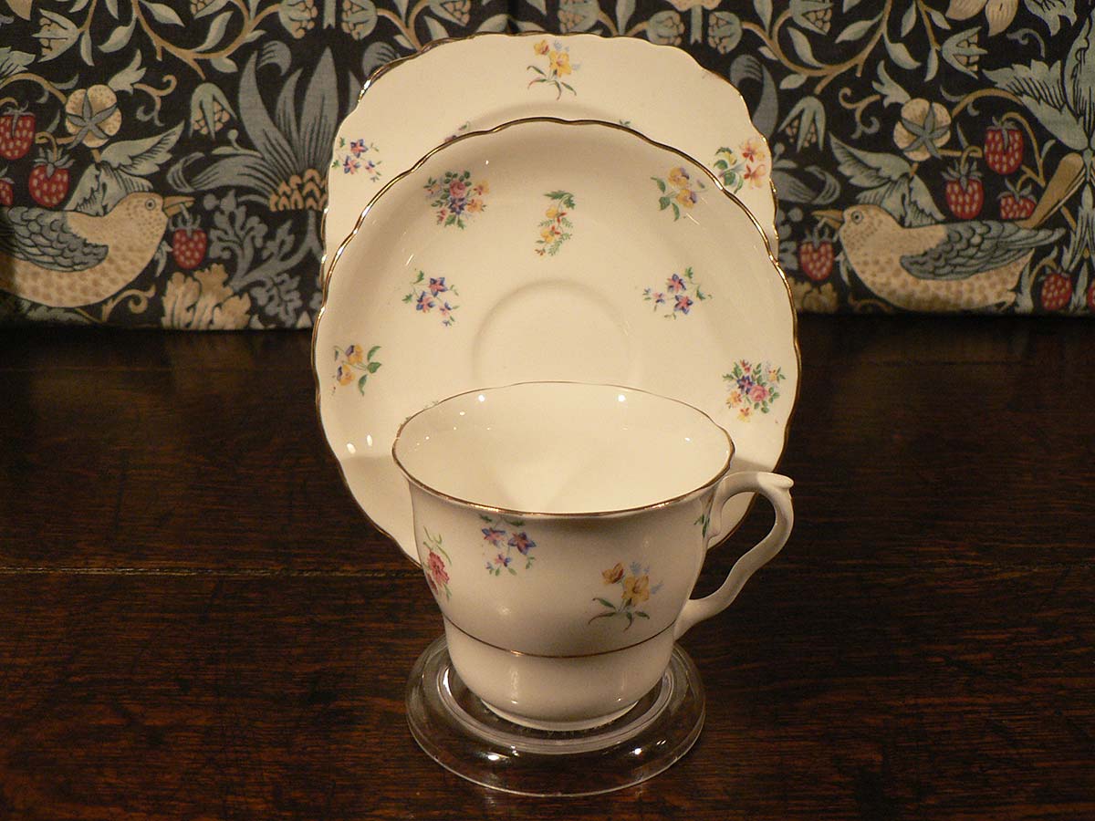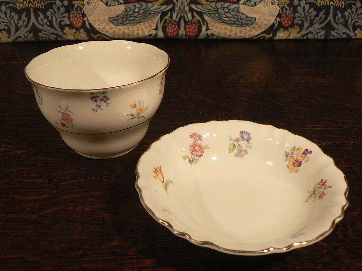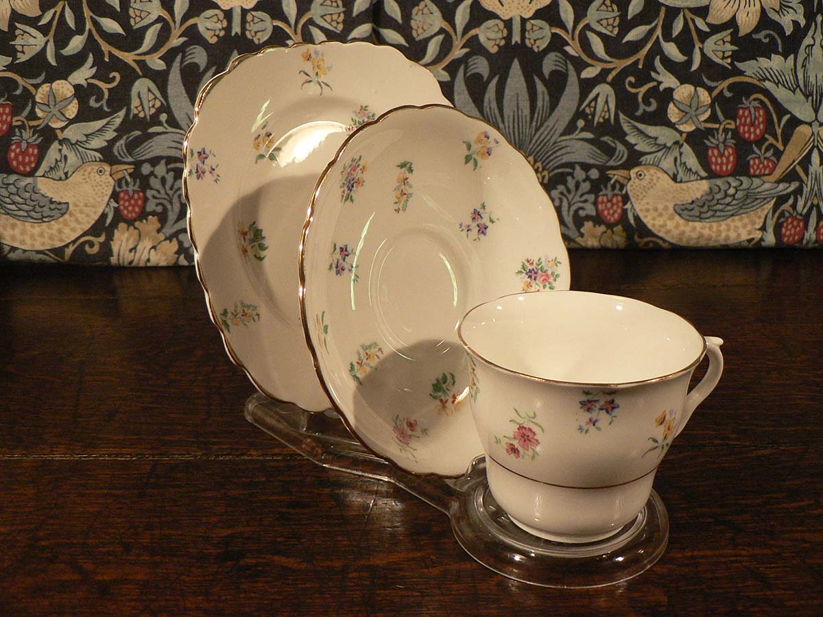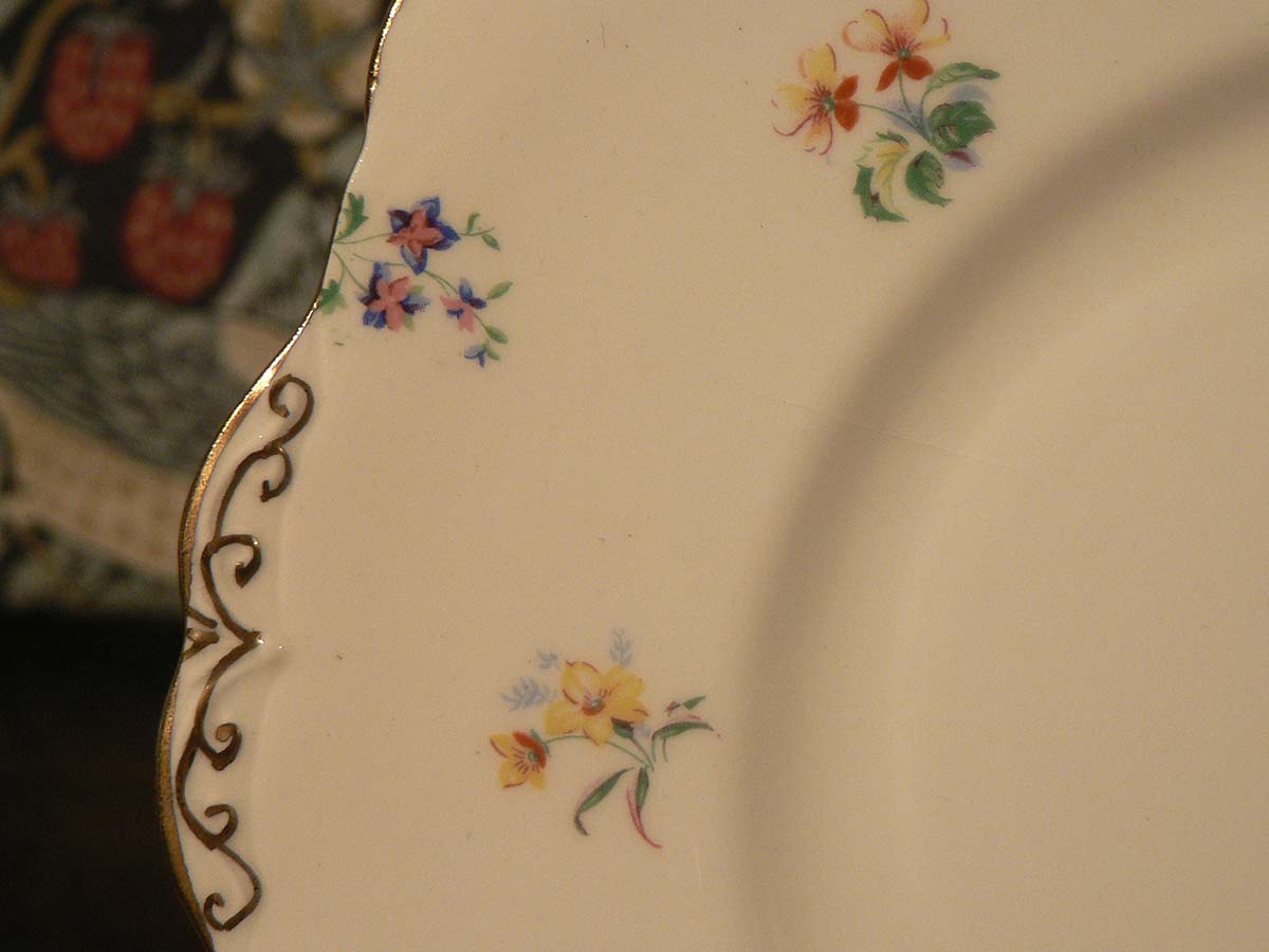 Gorgeous 24 piece tea set with pretty floral pattern and gilt edges. Made in Longton, England, 1939-1945. Pattern number 6581.