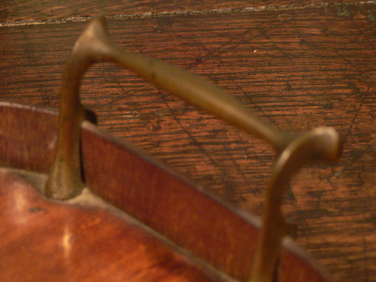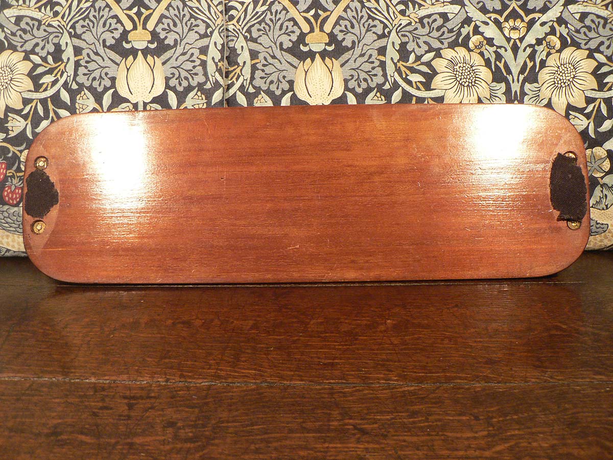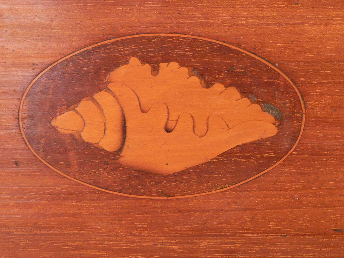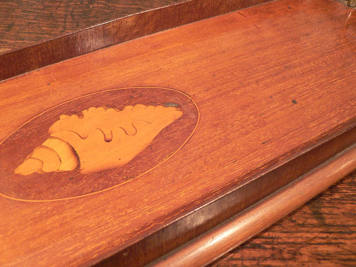 Sheraton inlaid rectangular gallery tray with blond wood shell central motif and brass handles.