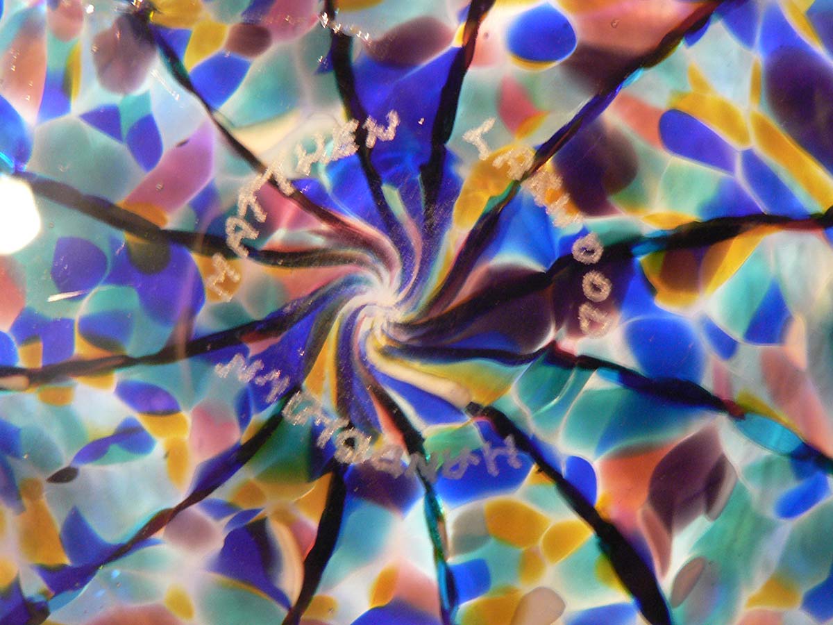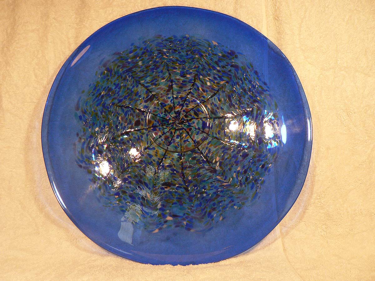 Huge Mathew Larwood handblown art glass centrepiece or platter. Blue glass with multicoloured central pattern. Signature to base.