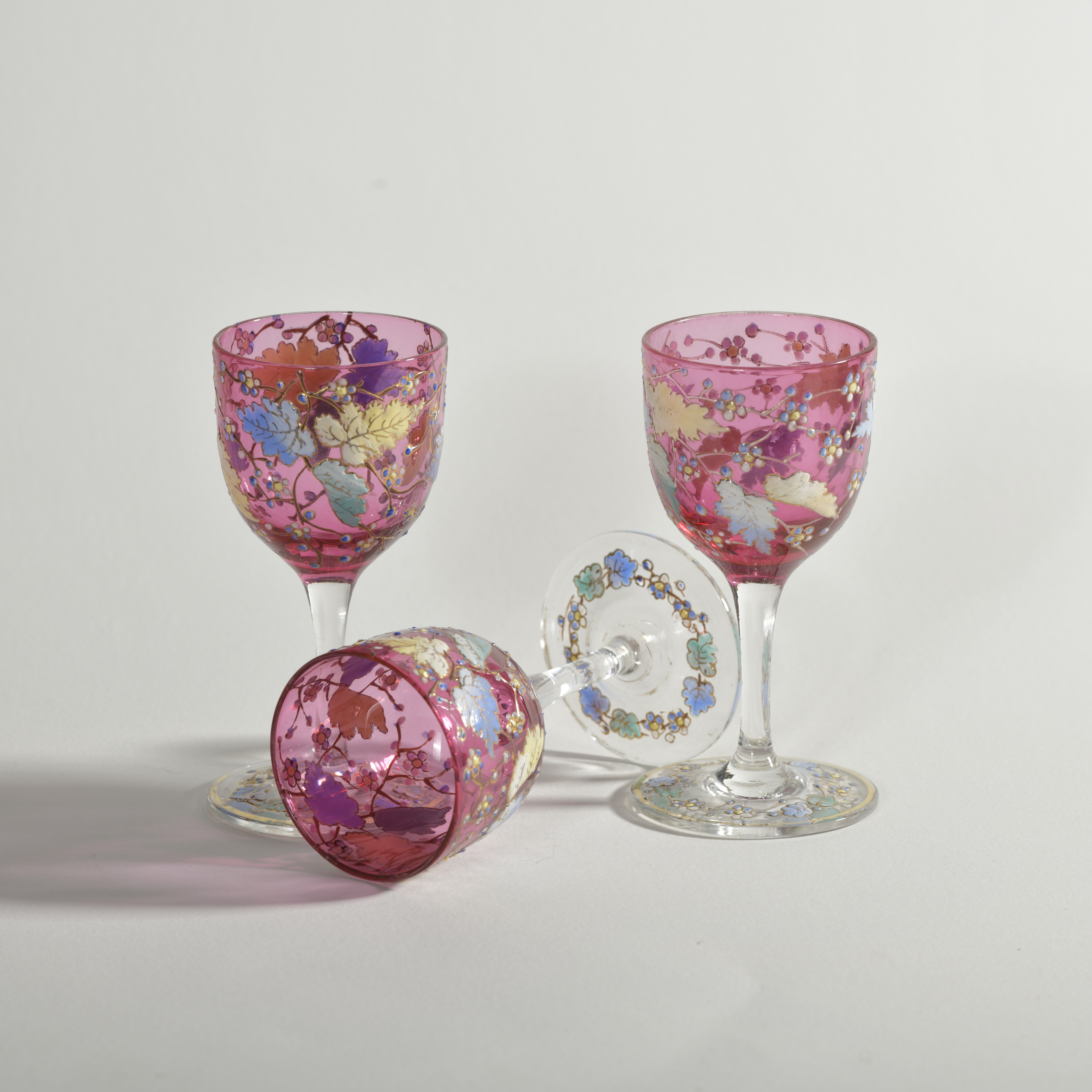 Three Antique Moser style ruby sherry or port glasses with enamelled leaves, vines and flowers.