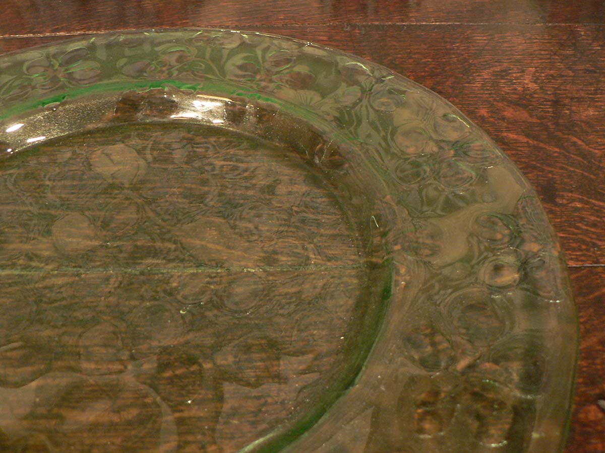 Green glass round serving plate with textured back impressed with a floral petal design.