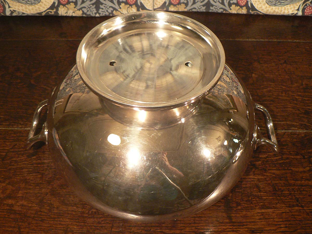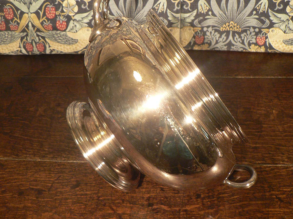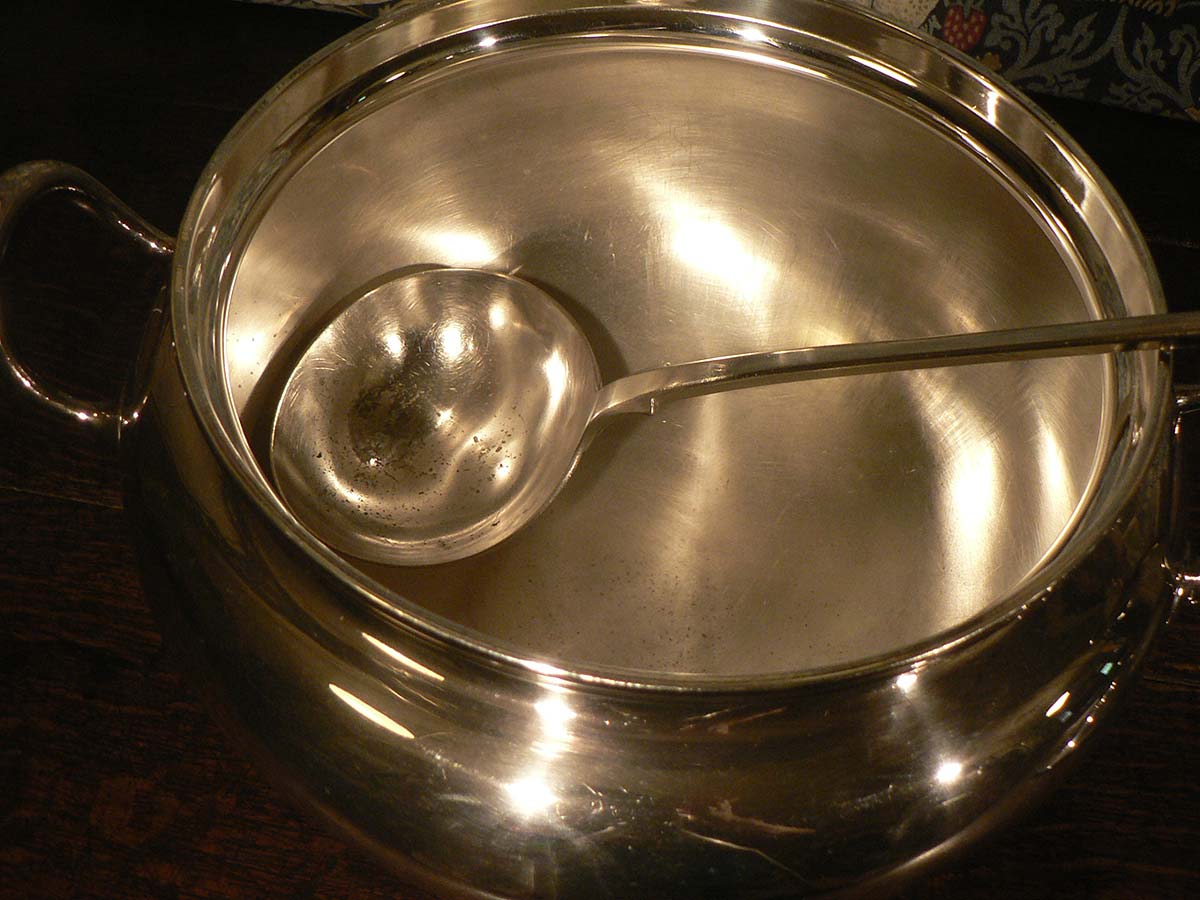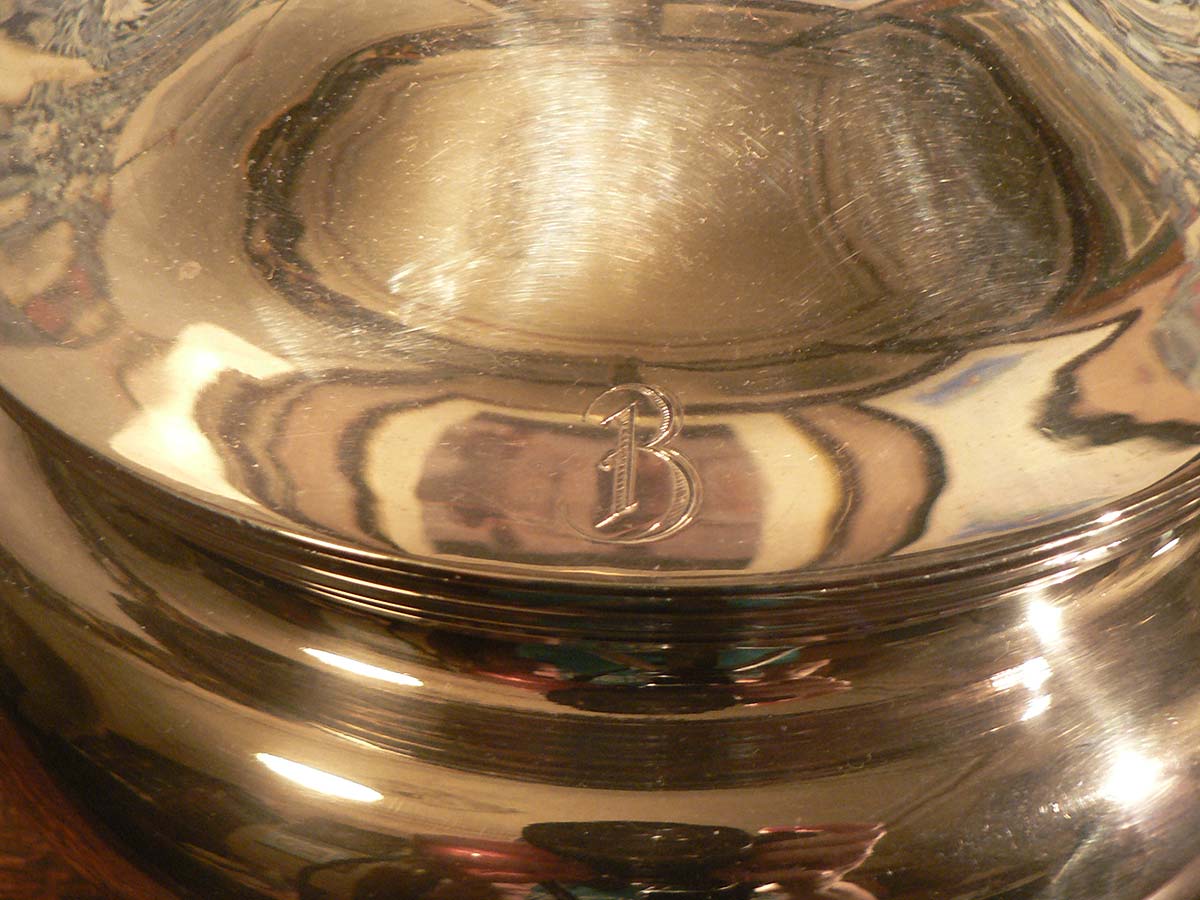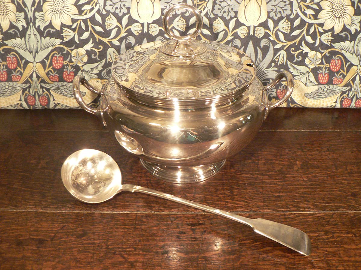 Gorgeous silver plated tureen and ladle with initial B engraved on the lid. Some pitting inside so please view photos carefully. This has just occurred with age and use.