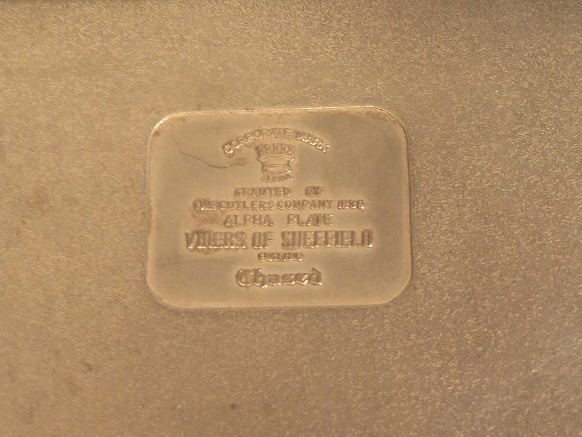 Inscription on back reads: Corporate Mark, Granted by The Cutlers Company 1836. Alpha Plate, Viners of Sheffield, England.