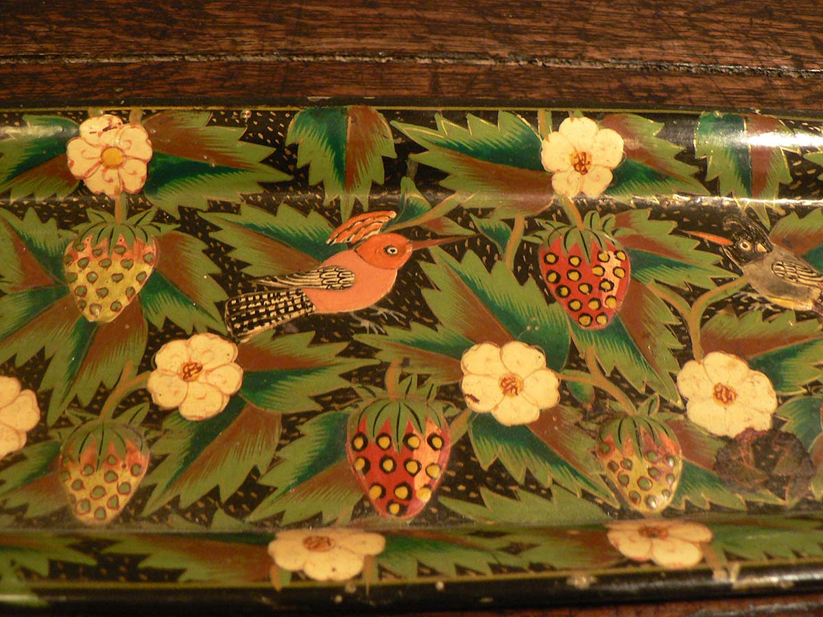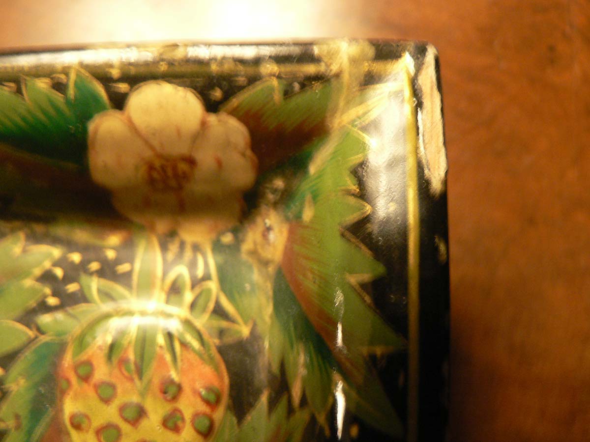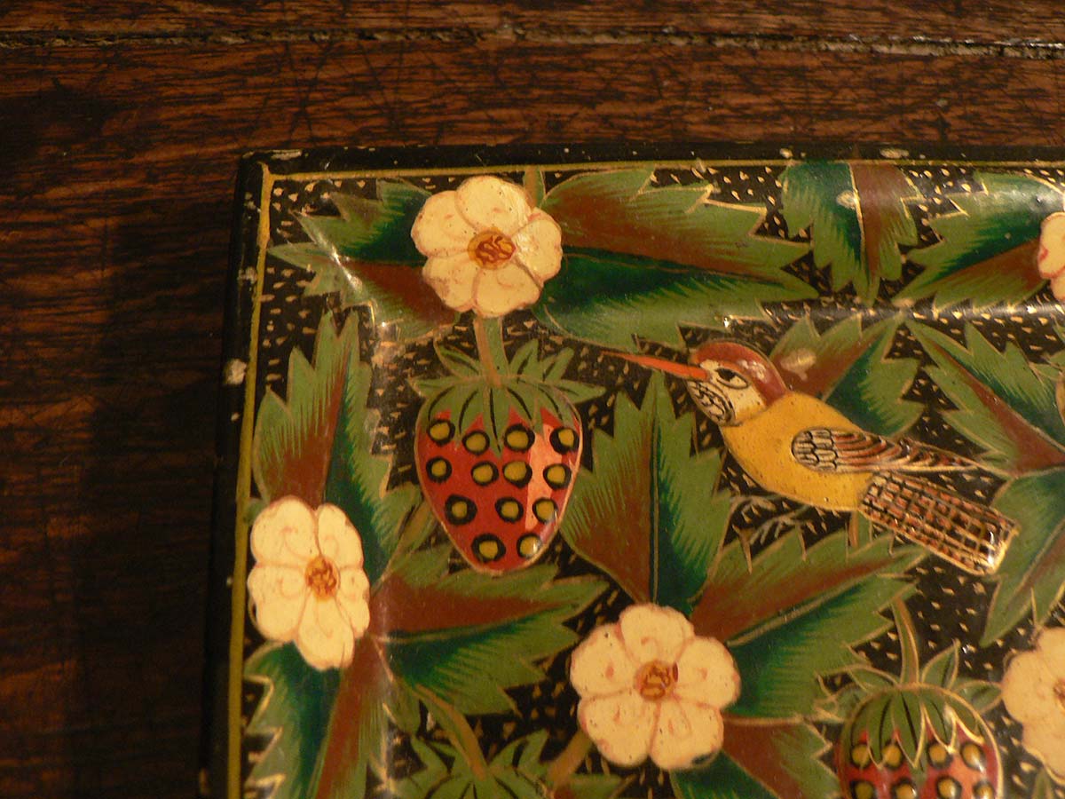 Vintage wooden tray with Papier Mâché stawberry and hummingbird design.